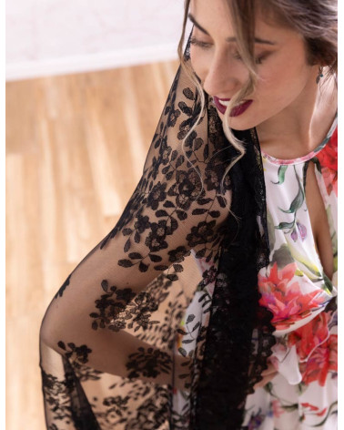 Media mantilla de tul negra bordada a mano en negro en seda natural.